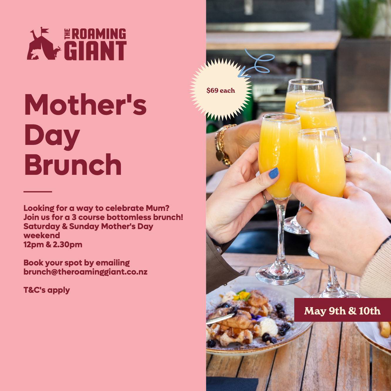 Book now by emailing brunch@theroaminggiant.co.nz