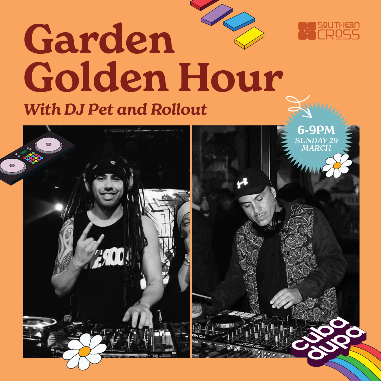 From 6-9pm, join us at the Southern Cross for Golden Hour in the Garden with DJ Pet & Rollout.