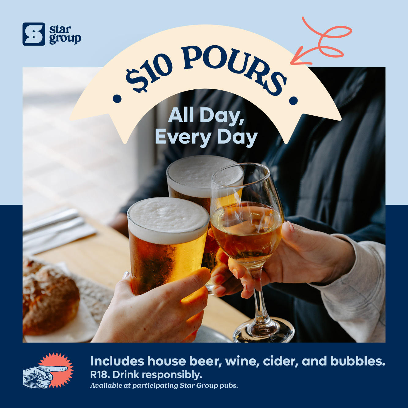 Yep, that's right - we’ve dropped prices. In a time when the world is bumping them up, we’ve gone the other way. Call us mad, but we’re serving up a heap of your go-to beers and wine favourites for just $10 - at 16 participating Star Group pubs.